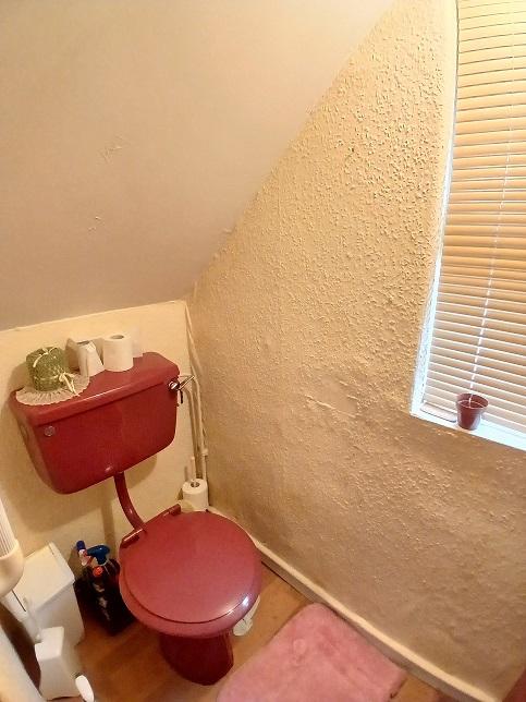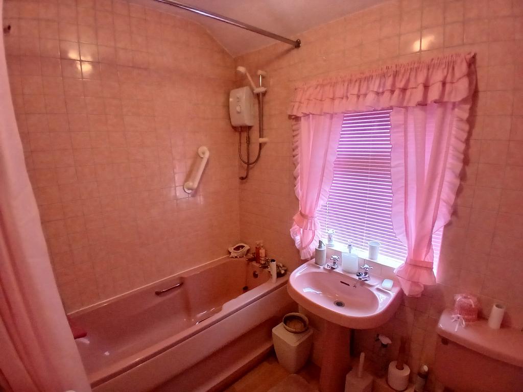 BATHROOM 7’ 6” (2.26m) x 6’ 2” (1.86m) having a pink suite comprising a panelled bath with an electric shower and a shower rail and curtain, a pedestal wash hand basin and a WC low suite. Wood effect vinyl flooring, part tiled walls, a single radiator and a uPVC double glazed window.