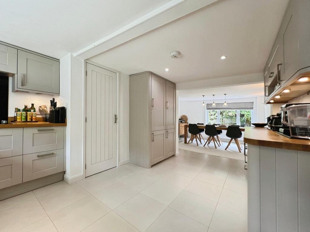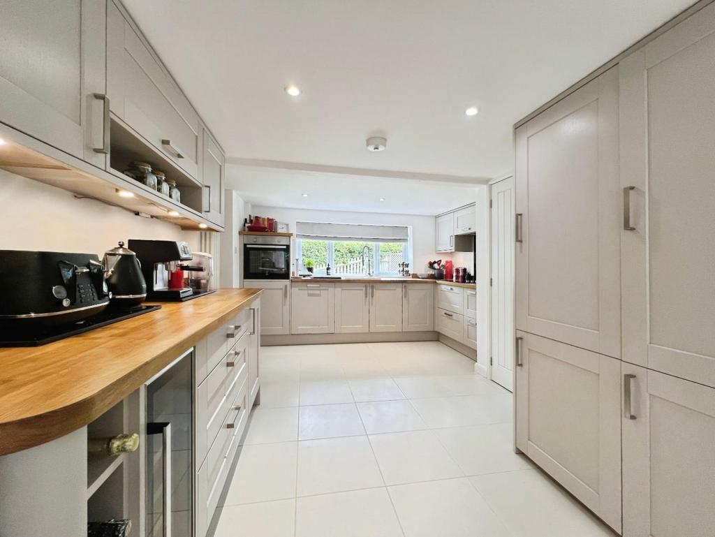 A further doorway leads into the stunning kitchen, also fitted with shaker style units and complementing Oak worksurfaces, with integrated dishwasher, fridge freezer, oven and hob with extractor above.
