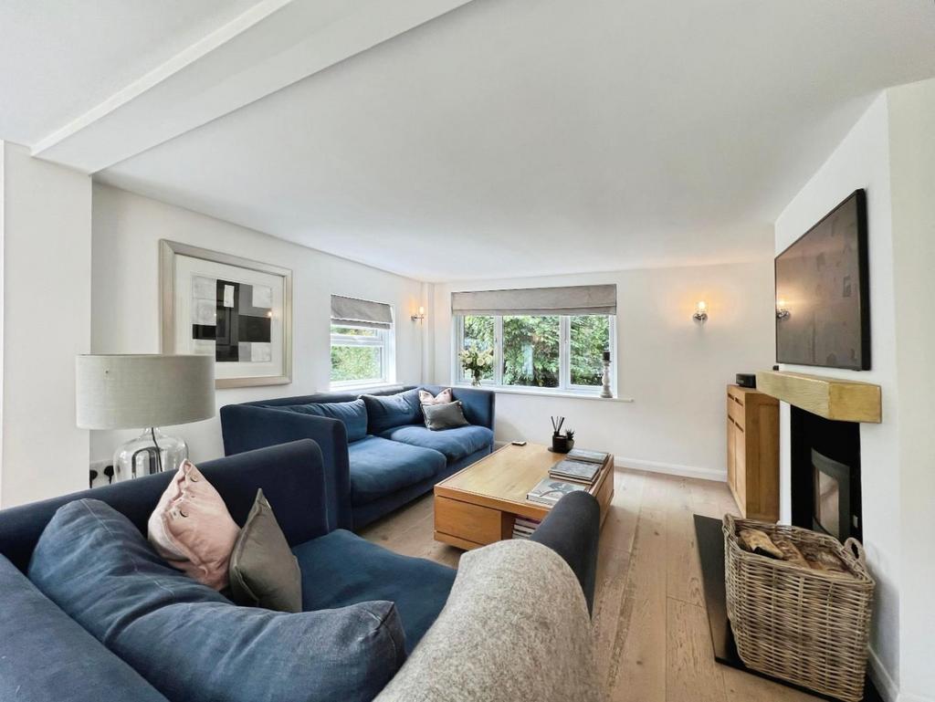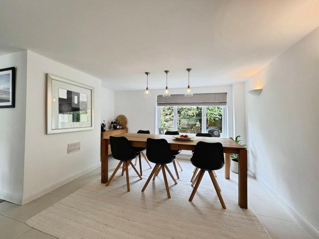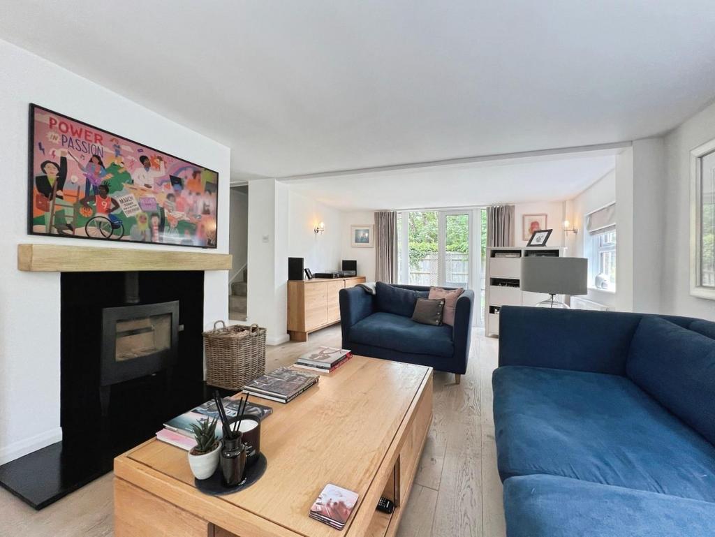 The kitchen is open onto the dining area which also offers stairs to first floor and leads into the bright triple aspect sitting room with striking oak flooring, log burning stove and French doors out to the rear garden.