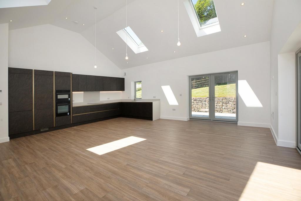 The entrance hall leads to the large, light, open plan kitchen/dining /living room with high vaulted ceiling with roof lights and French doors opening to the terrace and gardens. The fitted kitchen has integrated Neff appliances and Silestone (quartz) worktops. Off the hall is the utility room and off the kitchen is a study.