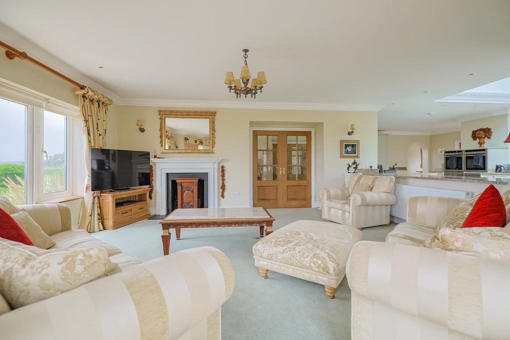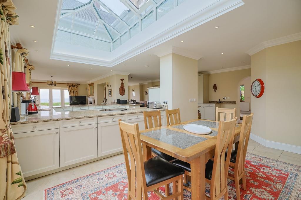 This spectacular open-plan space is a true heart of the home. An array of thoughtfully placed windows floods the area with natural light and showcases uninterrupted sea views. A stunning orangery-style window and four sets of double patio doors provide seamless indoor-outdoor living. The space is finished with a combination of tiled and carpeted flooring and enhanced by recessed spotlighting. The kitchen features a range of quality tall and base units with granite worktops and high-end integrated appliances, including two NEFF oven/grills, two NEFF warming drawers, a NEFF microwave, a 4-ring NEFF electric hob, Elica elevating extractor fan, a double Franke sunken sink with swan tap, NEFF dishwasher, a breakfast bar, and two tall fridge/freezers.