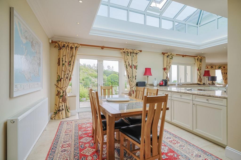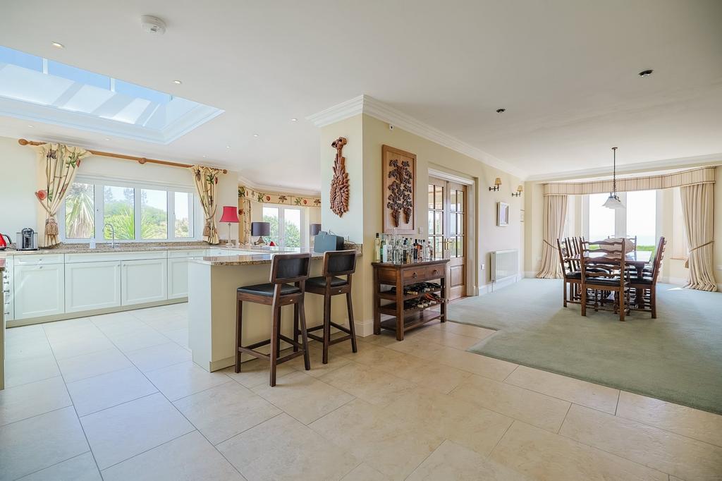 There's space for both a breakfast table and dining table, creating an ideal entertaining space. The family seating area is open to the kitchen and features an open fireplace with slate surround and hearth, carpeted flooring, and of course, outstanding views.