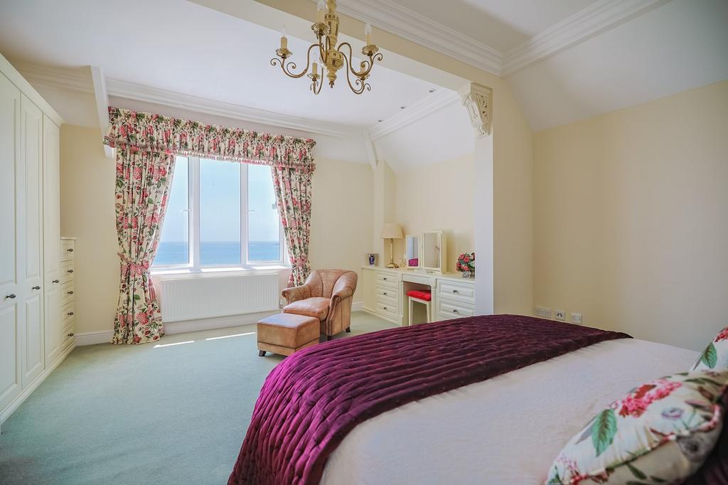 An exceptional principal suite with double doors opening to a Juliet balcony, presenting sensational sea views. This peaceful retreat also includes an additional side window with garden and ocean views, carpeted flooring, detailed coving, centre and spot lighting, and bespoke, hand-made, fitted wardrobes and bedside tables. The private ensuite features twin washbasins set into granite-topped, hand-made vanities, WC, a double walk-in shower, heated towel rail, two shaving points, extractor fan, spotlights, and a Velux window.