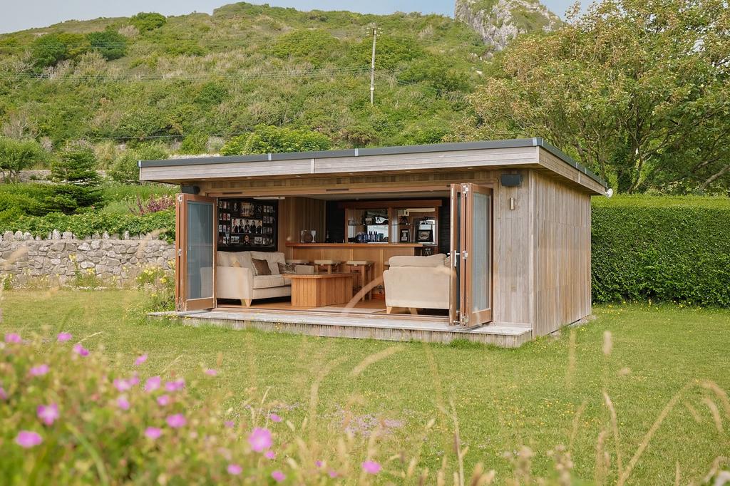 Within the grounds sits a remarkable cedar-clad garden room, a luxurious space that includes a cinema room, full bar, underfloor heating, sound system, WC, and spotlighting. Bi-folding doors open outwards, allowing you to sit back and soak in the coastal surroundings and the soothing sounds of the sea.
