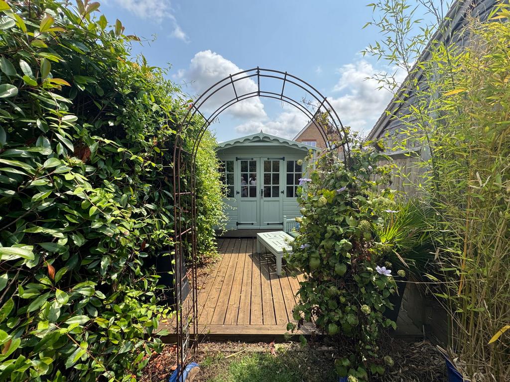 The property enjoys an area of front garden with car parking area. Side access incorporating service area and outside tap. The rear garden enjoys an area of paved terrace and decking and laid mainly to lawn with established shrubs, bushes and trees. Electric awnings over the deck and patio area. A feature of the garden is the rear independent access with twin gates providing additional parking to the rear. The garden extends to the side to a lovely secluded area with garden room and decking. To the front of the property is a garage with conventional opening doors and storage room beyond.