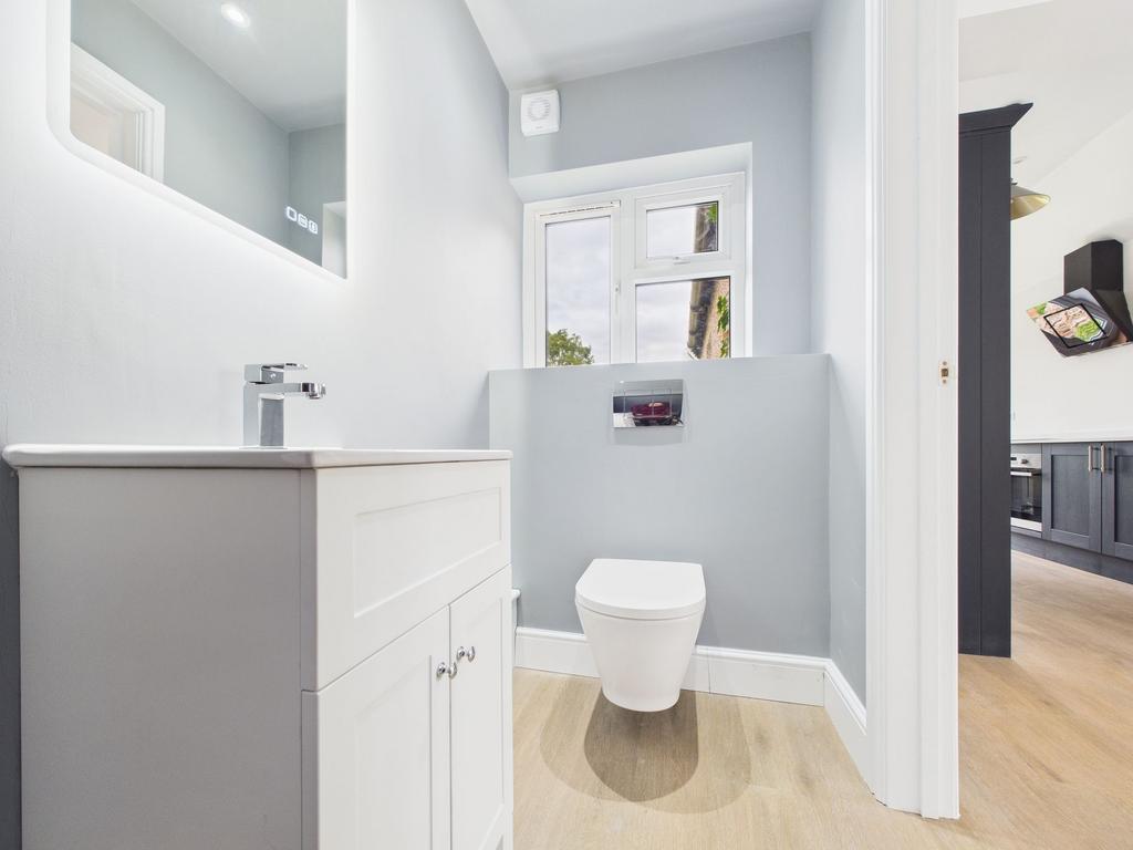 The kitchen has been beautifully refitted with a contemporary range of units, worktop space and appliances with a vaulted ceiling creating a lovely spacious feel. A WC completes the downstairs accommodation.
