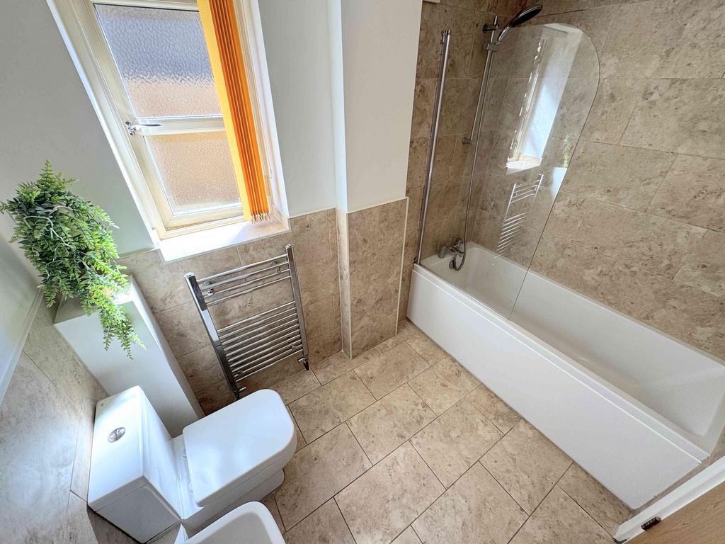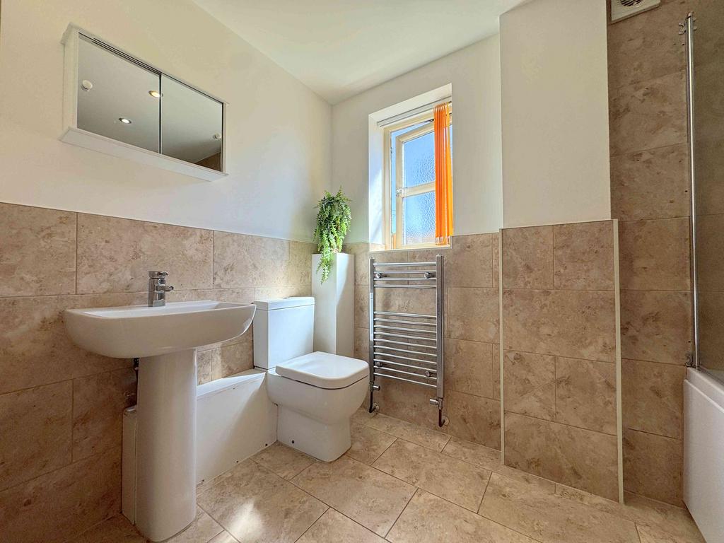 A contemporary three-piece bathroom suite comprising a bathtub with a shower above, pedestal sink, and low flush toilet. Finished with tiled flooring and partially tiled walls, the room also includes a chrome towel radiator, ceiling spotlights, extractor fan, and a UPVC window.