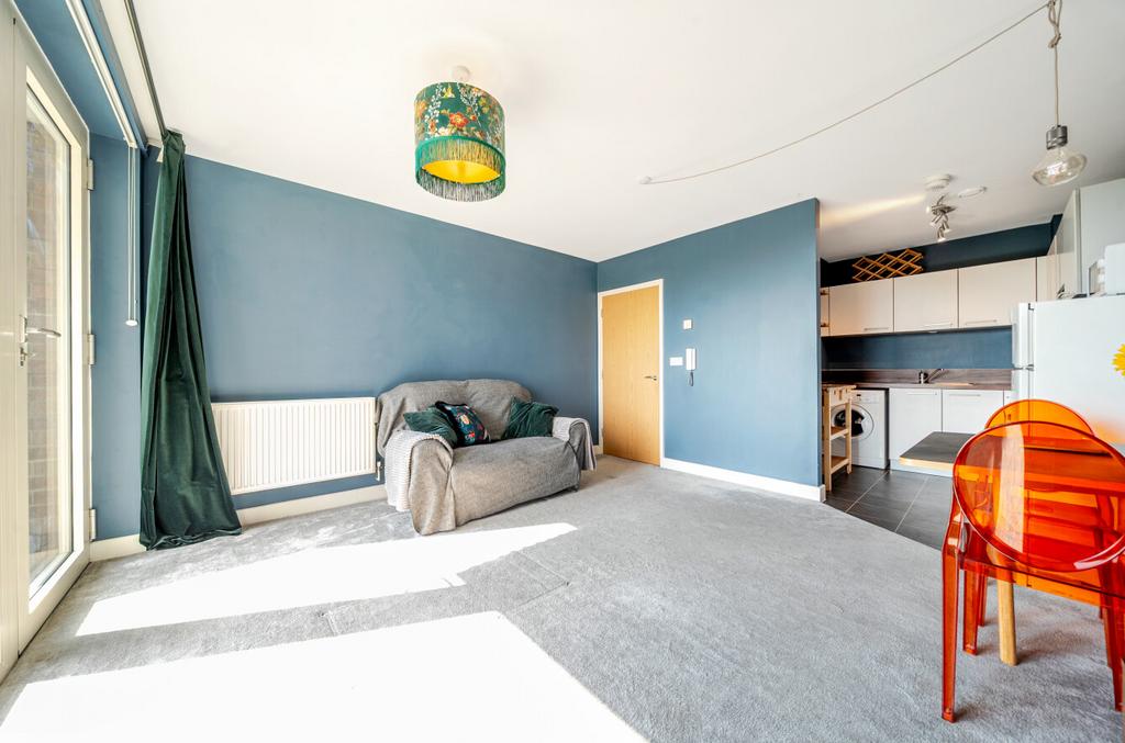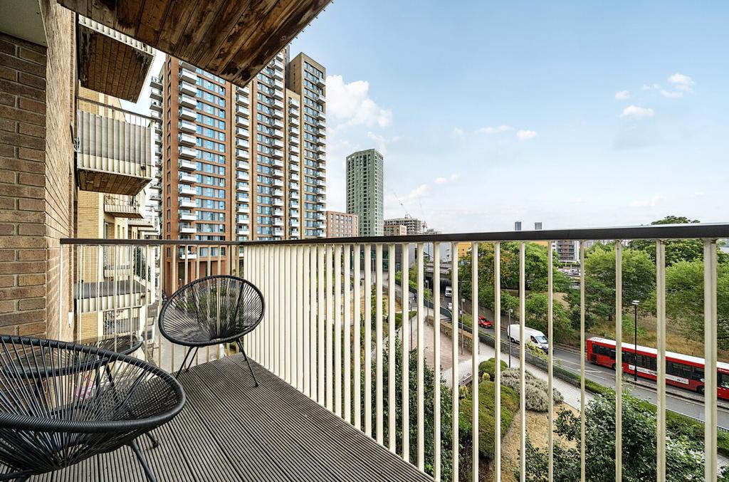SHARED OWNERSHIP (Advertised price represents 50% share. Full market value £325,000). This bright, modern apartment is on the fourth floor (building has a lift) and has a reception room with full-height windows and a door that leads out onto a balcony which provides a pleasant, east-facing view. The kitchen is semi open plan and features sleek, white units and contrasting work surfaces. There is a spacious bedroom, a stylish bathroom and three storage/utility cupboards in the entrance hallway. Well insulated walls, double glazing and a communal heating/hot water system make for a very good energy-efficiency rating. The development has a communal garden and is just minutes from Devons Road DLR and Bromley-by-Bow Station, for the District and Hammersmith & City Lines.