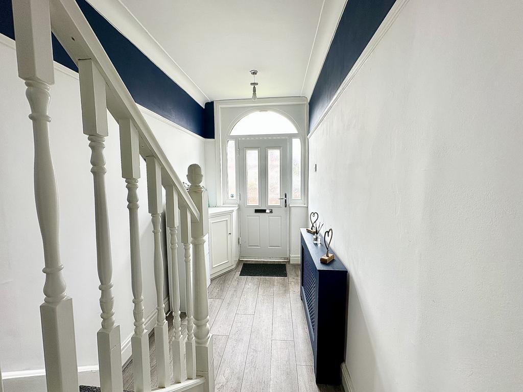 Entrance door, ceiling light point, coving, picture rail, radiator, stairs leading to the first floor, under stairs storage cupboard and a door leading to the reception room.