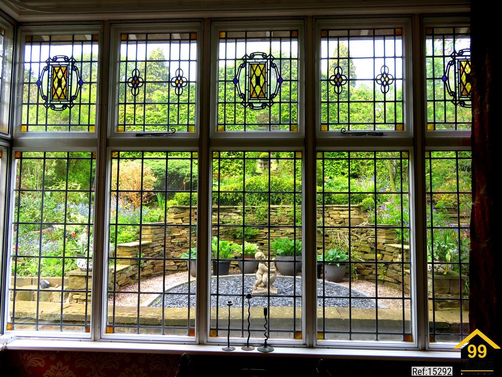 The living room is a very attractive room which also has decorative plasterwork on the ceiling and walls. On the west side is a huge and beautiful leaded bay window incorporating stained glass panels. A door on the south side leads into the conservatory.