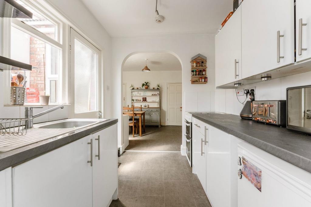 The ground floor comprises two spacious reception rooms – a cosy sitting room with exposed floorboards and an original-style fireplace, and a separate dining room with a second fireplace and storage cupboard. The kitchen opens up from the dining space via a charming archway and is fitted with a range of wall and base units.