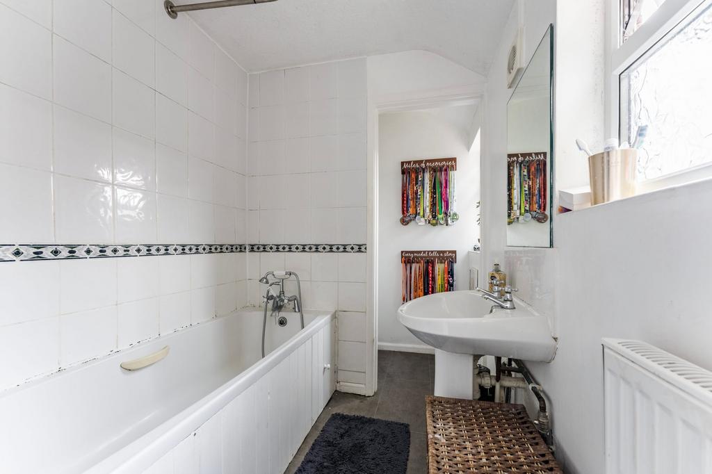Upstairs, the landing provides access to two well-proportioned double bedrooms, both with attractive cast iron-style fireplaces. A smaller third bedroom, ideal as a home office or nursery, enjoys views over the rear garden.