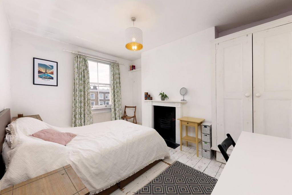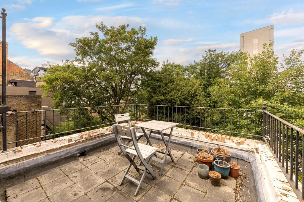 Upstairs you’ll find three bedrooms, all with wood flooring and neutral décor. The two larger bedrooms have a feature fireplace, and the main bedroom leads out onto a balcony space where you can access the roof terrace. The terrace has space for a table and chairs, the perfect spot for dining al fresco or enjoying a few drinks with friends in the summer months.