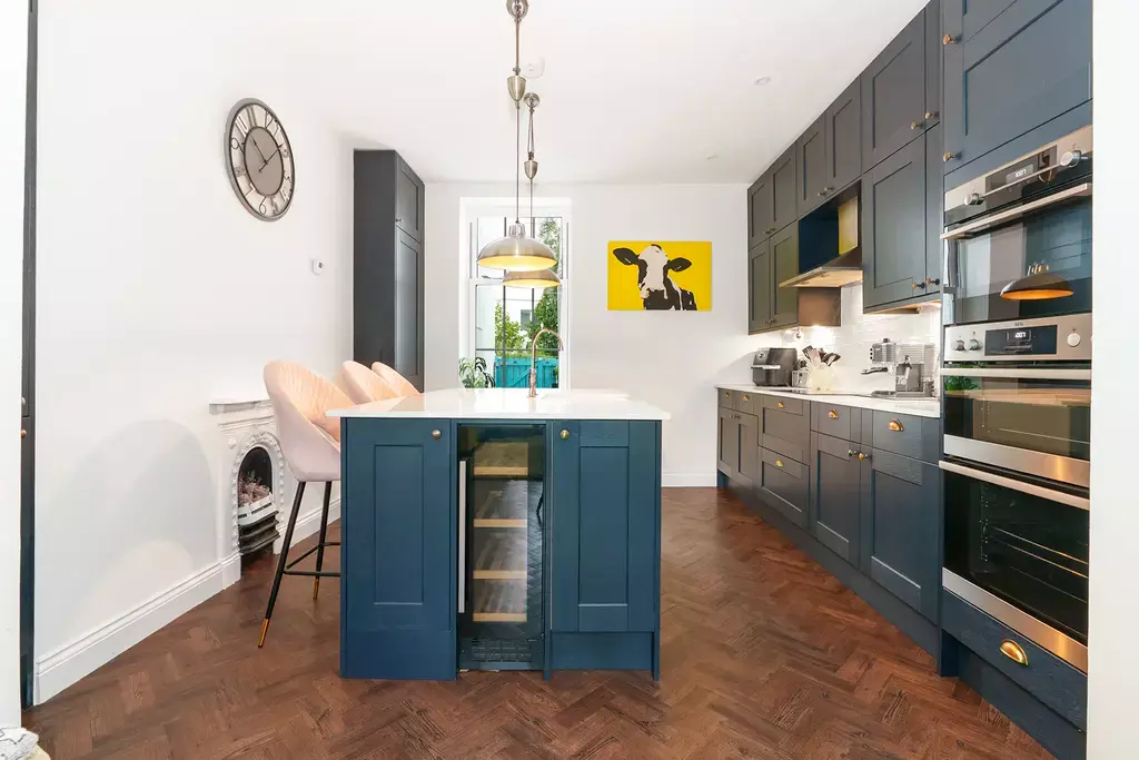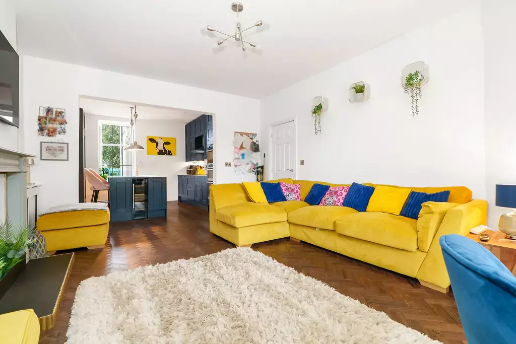 The ground floor boasts an impressive and stylish living room with a feature bay window and a square opening leading into the bespoke fitted breakfast kitchen, which includes a large island unit — creating the perfect sociable space for family life and entertaining.