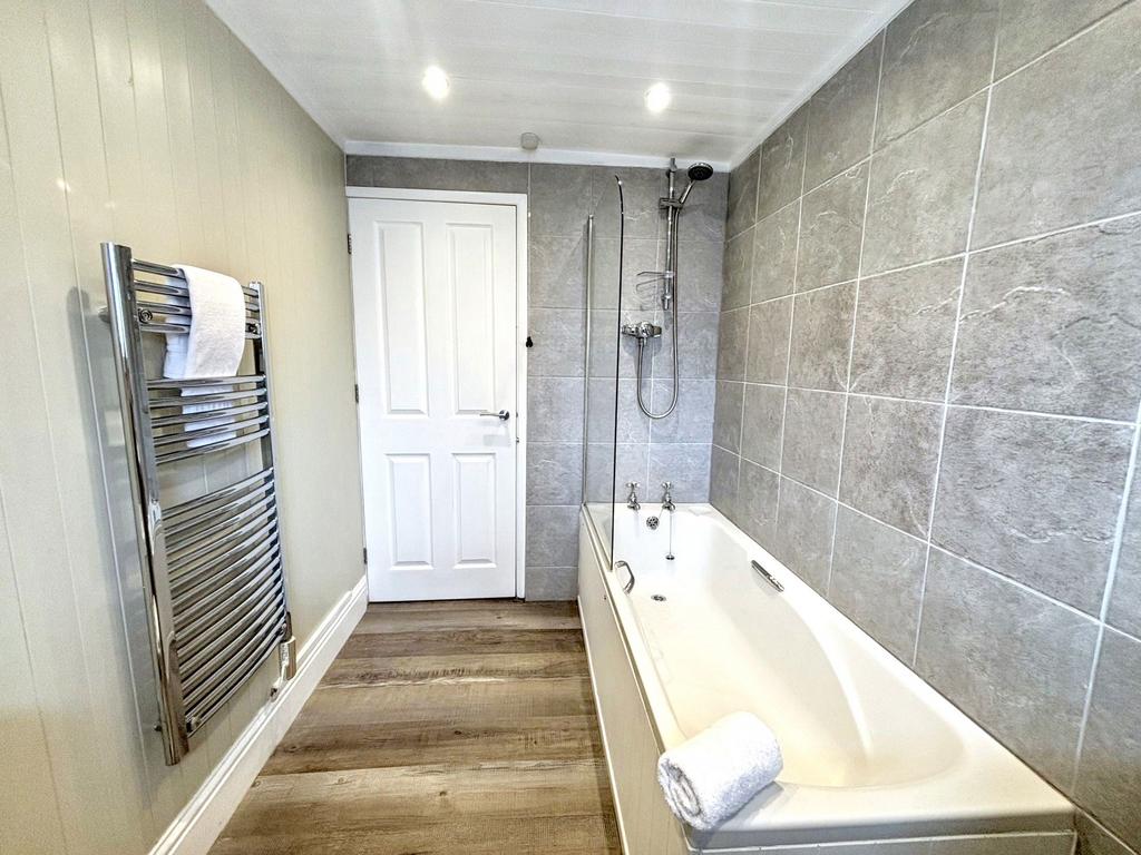 Also located on the ground floor and fitted with white three piece suite comprising: bath with shower over, low level WC and wash hand basin. The wall and floor coverings complement the suite nicely and there is a heated towel rail and double glazed window to the side elevation.