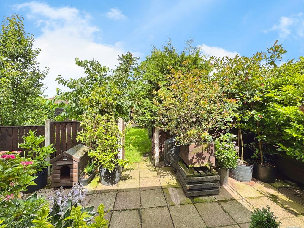 The garden is a true delight, with a variety of trees and bushes that frame a picturesque patio area adjacent to the house, and another at the garden's end. The lawn is well kept, and the inclusion of a shed adds practicality to this fantastic outdoor space, ideal for children's adventures, pottering around with your plants or sophisticated BBQ entertaining.