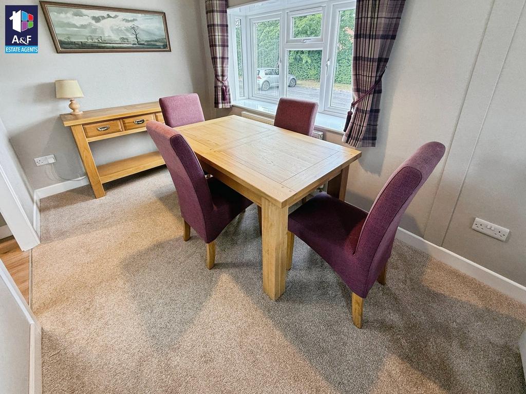 Step into a bright and spacious L-shaped lounge and dining area, tastefully presented with an elegant cream Flammette fireplace set on a black granite hearth. The almond hessian-backed carpet with underlay adds comfort, while bone tartan curtains and matching scatter cushions create a cosy, welcoming atmosphere.