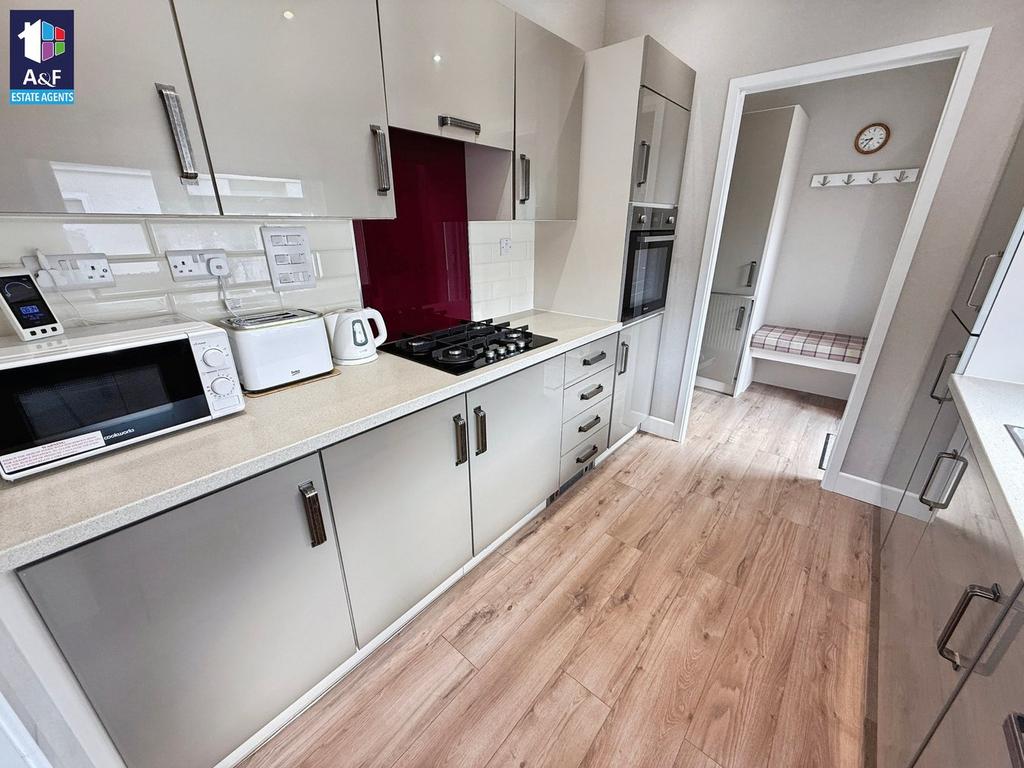 The kitchen is sleek and modern, featuring champagne metallic units with brushed steel handles, a cream matte worktop, and a bold violet glass splashback. Practical laminate flooring runs through to the adjoining boot room, which includes a coat rack, storage cupboards, and a cushioned seat – perfect for everyday use. Integrated appliances include a fridge-freezer, washing machine, dishwasher, electric oven, hob, and extractor. Inset ceiling spotlights and a Highland check Roman blind complete the look with style and functionality.