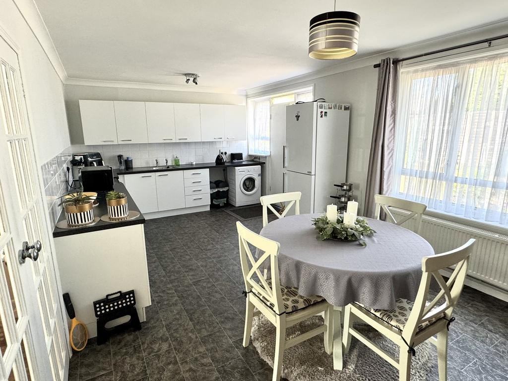 Kitchen/Dining room: 20’1” x 11’2”, (6.1m x 3.4m). A new modern Kitchen/Dining Room with generous space including a Stainless-steel sink unit with mixer tap, set in fitted work surface with drawers, cupboards, appliance space and plumbing for washing machine under. Further fitted work top with cupboards and appliance space under. Integral “Hae 160” 4 ring electric hob unit, with electric oven under. Matching range of wall mounted cupboard units. Half double glazed door to outside.