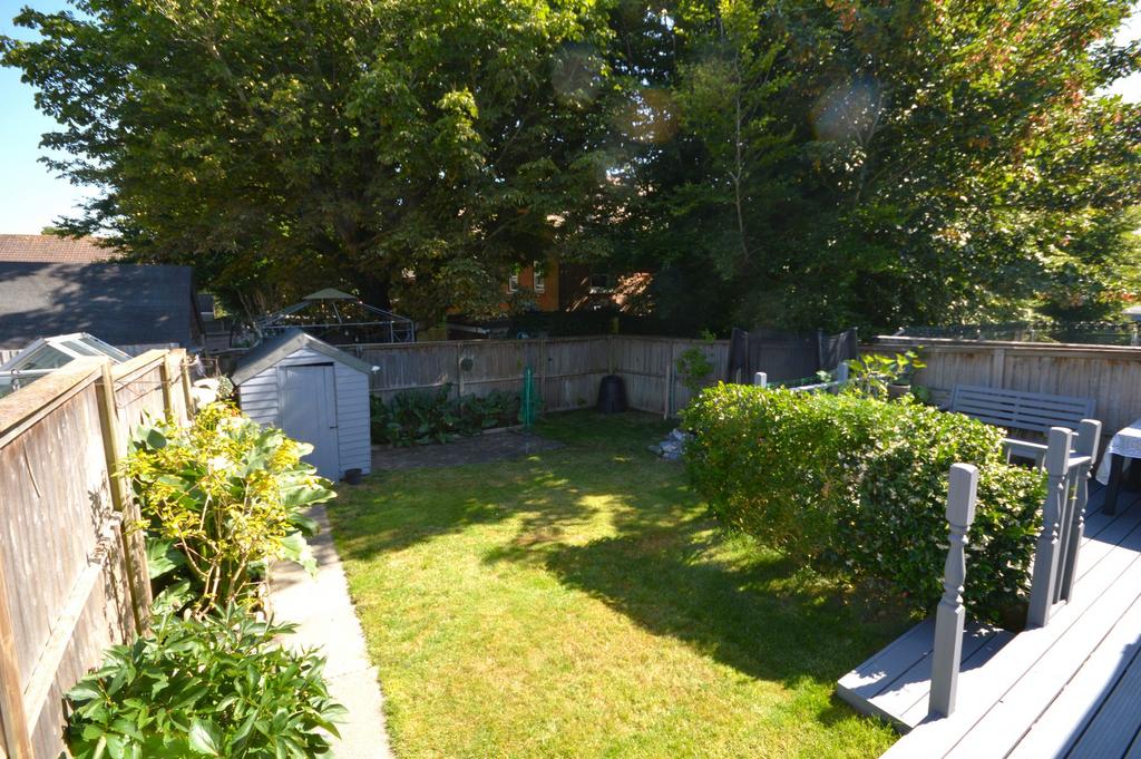 Good size family garden with a raised up decking area with step down to area laid to lawn with outside shed and side access.