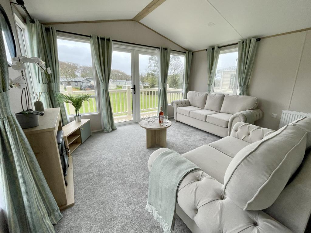 Boasting a lofty 7 ft ceiling height and deep-aspect windows, this model floods your open-plan lounge-diner with light, creating a bright and airy retreat that flows effortlessly outdoors via front-opening patio doors. Sink into the elegant freestanding sofas beside a feature electric fire for those cosier evenings.