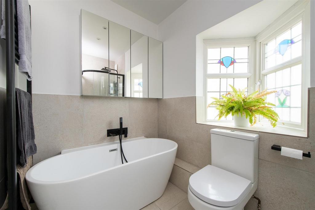 Bathroom - Bath with mixer tap, heated towel rail, low level w,c, shower, wash hand basin with mixer tap and storage below, double glazed window to side, tiled floor and splash backs and extractor fan