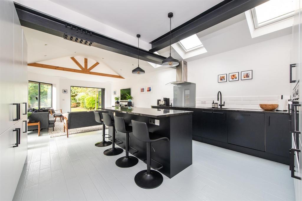 Breakfast Kitchen - 9.32 x 4.39 - Under floor heating, range of wall and base units with work surface over incorporating sink with mixer tap, induction hob with extractor hood over, integrated ovens, dishwasher, fridge, freezer, breakfast bar, skylights, double glazed windows and bi folds with fitted blinds