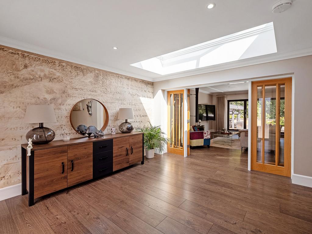 This stunning property is a single-storey modern home with a clean and minimal aesthetic, which backs directly onto woodlands, and an array of wonderful rooms perfect for entertaining with family and friends.
