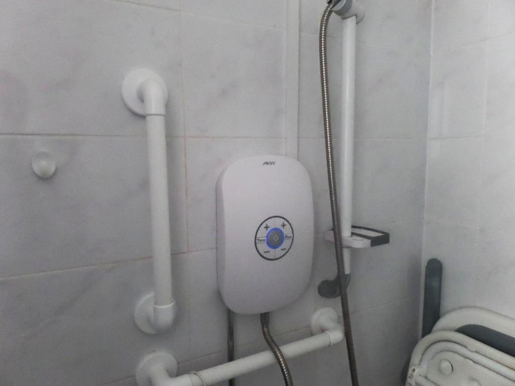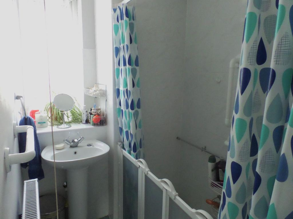 Comprising shower unit, electric shower, wash-hand basin, and double glazed window to rear.