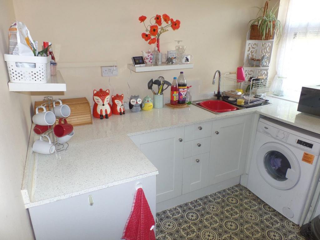 Comprising a range of fitted units, square-edge work surfaces, sink unit, plumbing for washing machine, double glazed window to rear, ceramic splash-backs, larder, and electric power points.