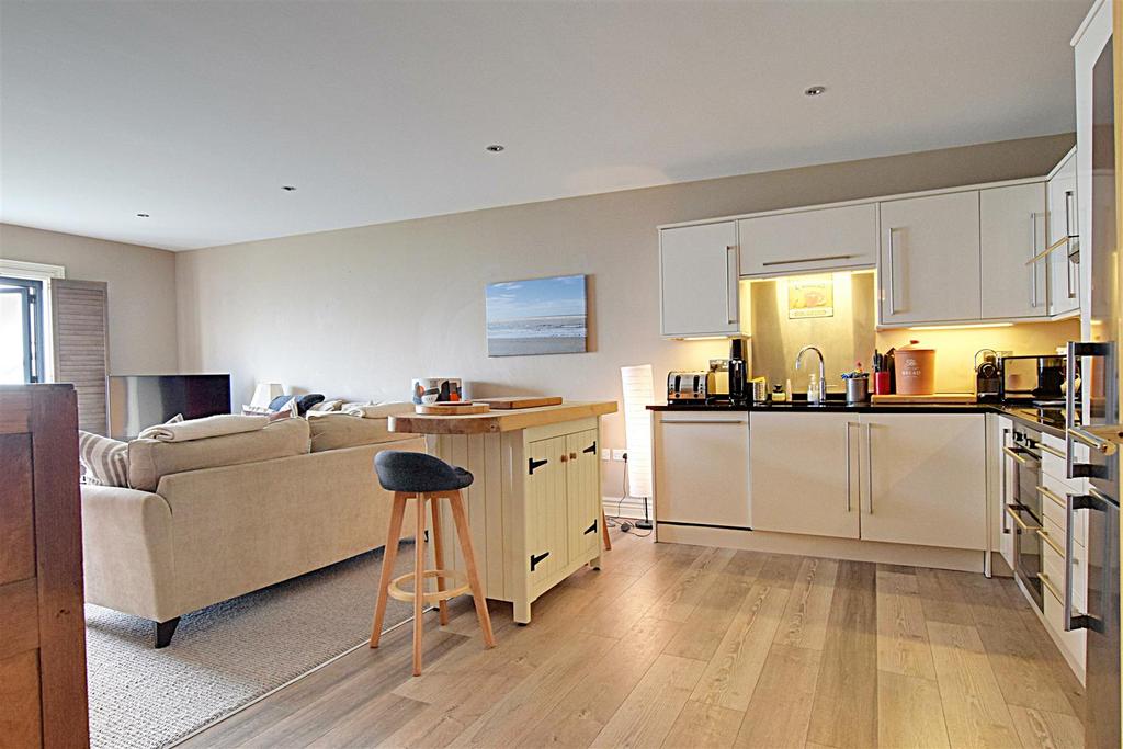 Living/Dining/Kitchen - 8.43m x 4.37m (27'8 x 14'4 ) - Kitchen comprises engineered oak flooring, a range of modern high gloss finish base and wall units with granite worktops, Quooker tap for instant boiling water, one and a half bowl single drainer sink unit with mixer tap, built-in dishwasher, fridge/freezer, inset double oven and grill, electric hob, brushed stainless steel splash-back with matching canopy and light, built-in washing machine/ tumble dryer, concealed lighting, freestanding kitchen island. The breakfast/living room area has two slimline electric radiators, marine grade bi-fold doors with uninterrupted views of the English Channel which leads onto the balcony/terrace area southerly facing.