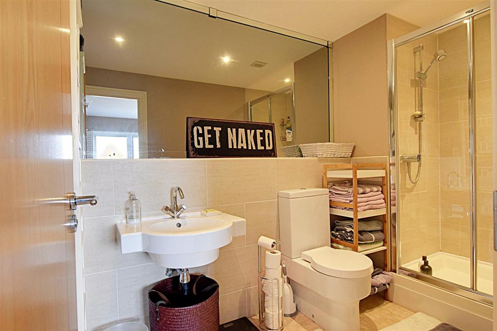 En Suite Shower Room - Comprising contemporary wash hand basin, w.c. with low level flush, walk-in double width shower with chrome controls and chrome shower head and fixing, chrome heated towel rail, mosaic floor tiling and wall tiling, full width mirror, electric shaver point and light.