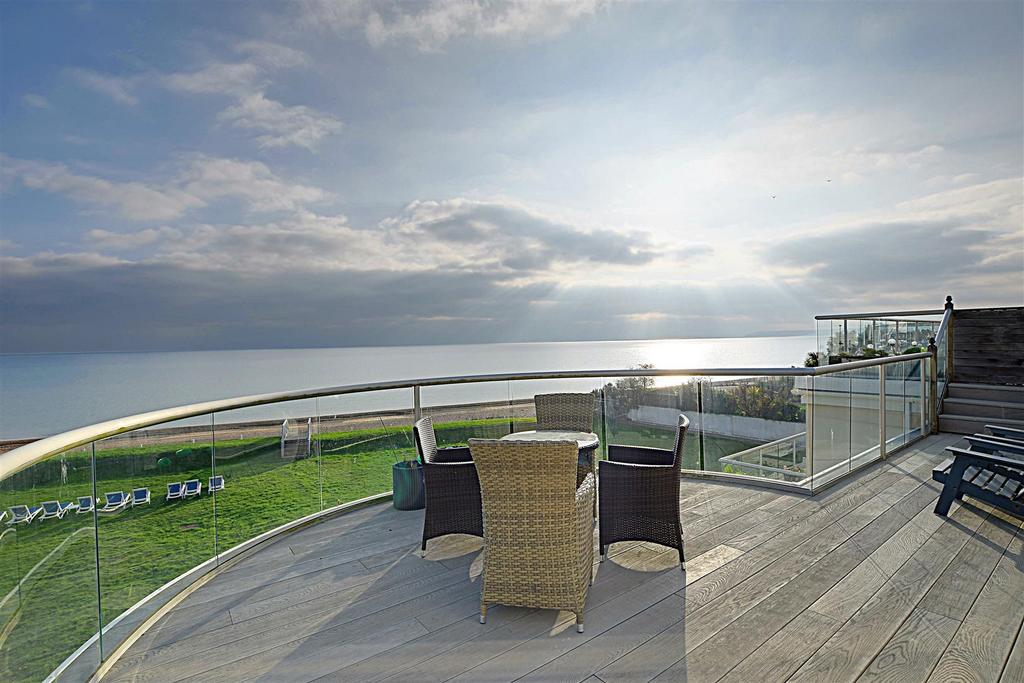 Sun Terrace - De La Warr Pavillion style wrap around balcony, all neatly enclosed with glass and hand railing, curved and decked with outside courtesy lighting and to the side is a barbecue area with two timber framed storage sheds and stunning uninterrupted views across to Beachy Head. Outside power.