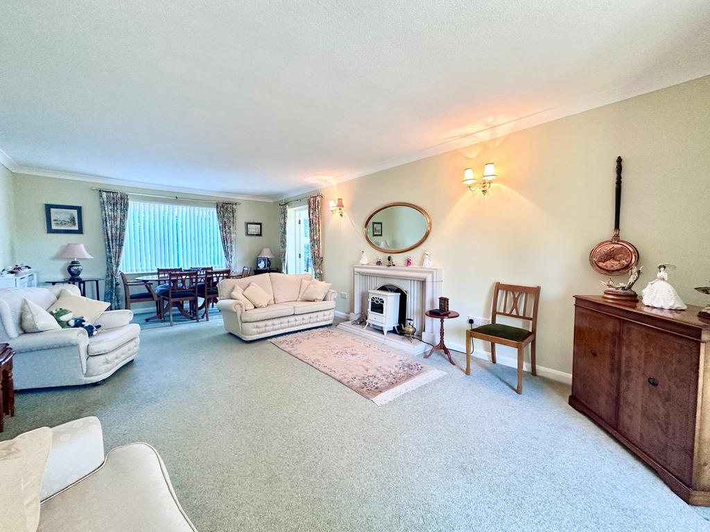 13' 5" x 23' 5" (4.09m x 7.14m) with large window to front and French sliding doors to rear opening onto a recessed patio area, feature fireplace with open grate, two radiators, power points, T.V point, coving, wall light points. Double doors to;