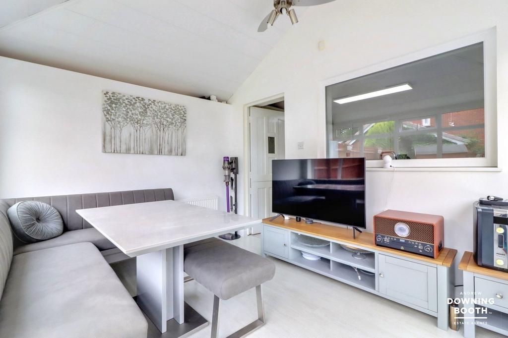 The sun room is fitted with a wood effect flooring and radiator, there is also a ceiling fan. Upvc double glazing looks out to the side and rear elevations whilst side facing double doors with double glazed panels inset open out to the rear garden.