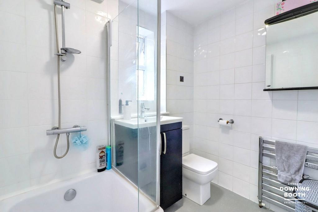 The bathroom is fitted with a contemporary white suite which includes a low level flush w.c., a vanity unit with wash basin and chrome mixer tap, a 'P shaped panelled bath with chrome mixer tap and shower over. There is an extractor fan, a wall mounted chrome heated towel rail, fully tiled walls and side facing upvc double glazed windows.