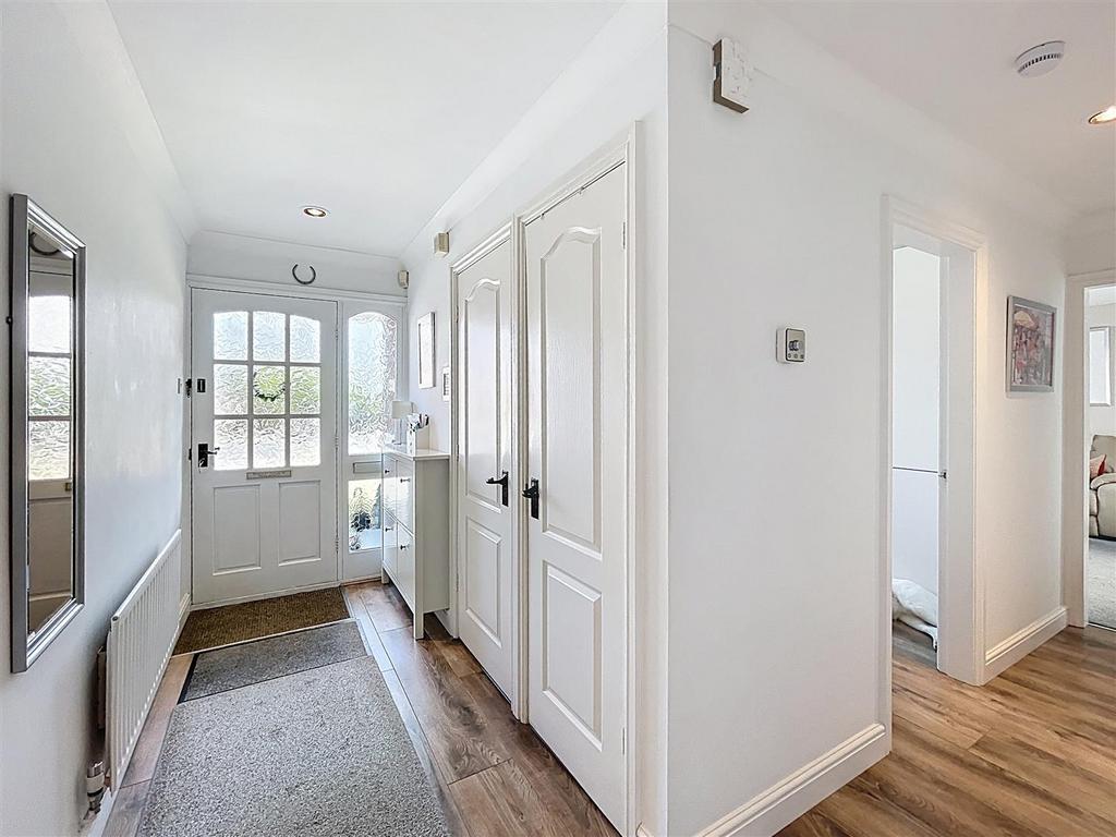 Reception Hall - With laminate flooring and inset matting, built-in storage cupboards with space for a tumble dryer and storage, built-in boiler cupboard with a Vaillant ecomax condensing gas-fired boiler, and airing shelves