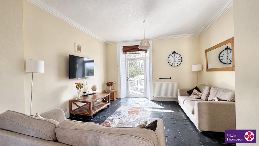 Fabulously spacious room with lovely slate floor throughout. High ceilings with coving. Radiator. Door out to the roof top terrace with stunning view of Catbells, and Skiddaw. This room blend in to a great size dining area with a large window looking to the front aspect and to the town. Plenty of room for a large dining table and chairs. Radiator.