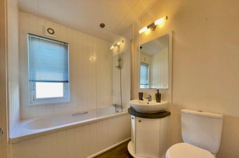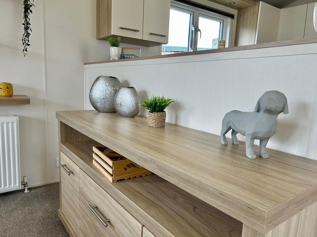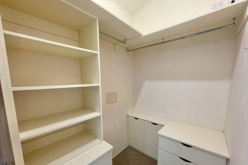 The Willerby Clearwater is a stunning lodge holiday home which at 20ft wide and 40ft long, gives you huge amounts of space for all the family to enjoy. You also have the benefit of the large decking that extends the living space even further, ideal for enjoying the summer sun or alfresco dining! The ‘double-unit’ Clearwater has freestanding furniture and coffee table in the living room. Along with an electric fire, and space for your TV too. It’s perfect for relaxing in the evening, or just watching some TV on a morning. The space of the living areas, compared with a standard holiday home is vast. The dining table is free standing, set in front of the large windows, letting all that natural light in. The kitchen is U-shaped with appliances galore, ensuring your holiday is never hard work. The integrated dishwasher, washing machine/dryer, microwave, fridge and freezer ensure you have everything you need in the kitchen, coupled with the oven and gas hob cooker with over-head extractor, all with lots of worktop and cupboard space which is modern, glossy and sophisticated. The bedrooms comprise of one master room and one twin room. The master room has a large walk-in wardrobe which leads through to an en-suite shower room, with WC and wash basin too. The twin room also has a walk-in wardrobe. The family bathroom has a bath with overhead shower, WC and wash basin, finished to a stunningly high standard. It is highly recommended that if you are thinking about this lodge, to come along and view it, as the size and quality of this lodge are best seen in person.