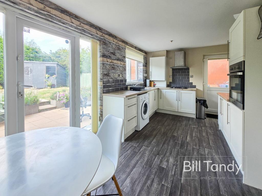 5.03m x 2.88m (16' 6" x 9' 5") having a superb range of re-fitted Shaker style base cupboards and drawers with round edge work tops above, matching wall mounted cupboards, tiled splashback surround, inset stainless steel sink, inset oven with four ring gas hob and extractor fan above, radiator, space for washing machine and fridge/freezer, double glazed door to rear with windows either side opening to the rear garden, additional double glazed door to side and useful store cupboard/pantry beneath the stairs.