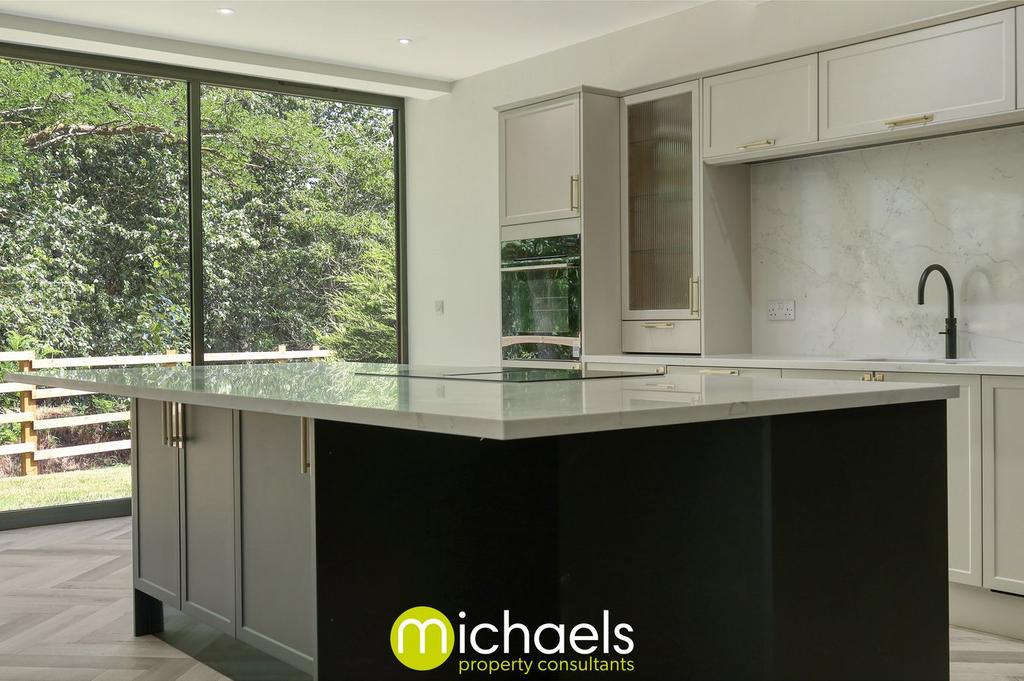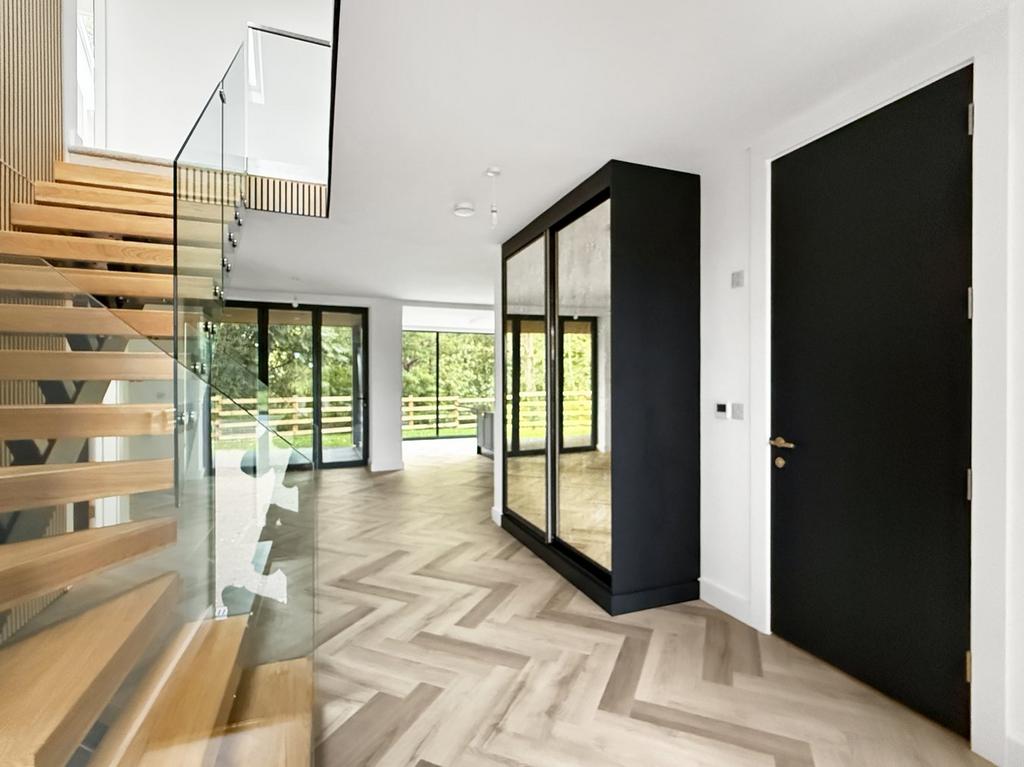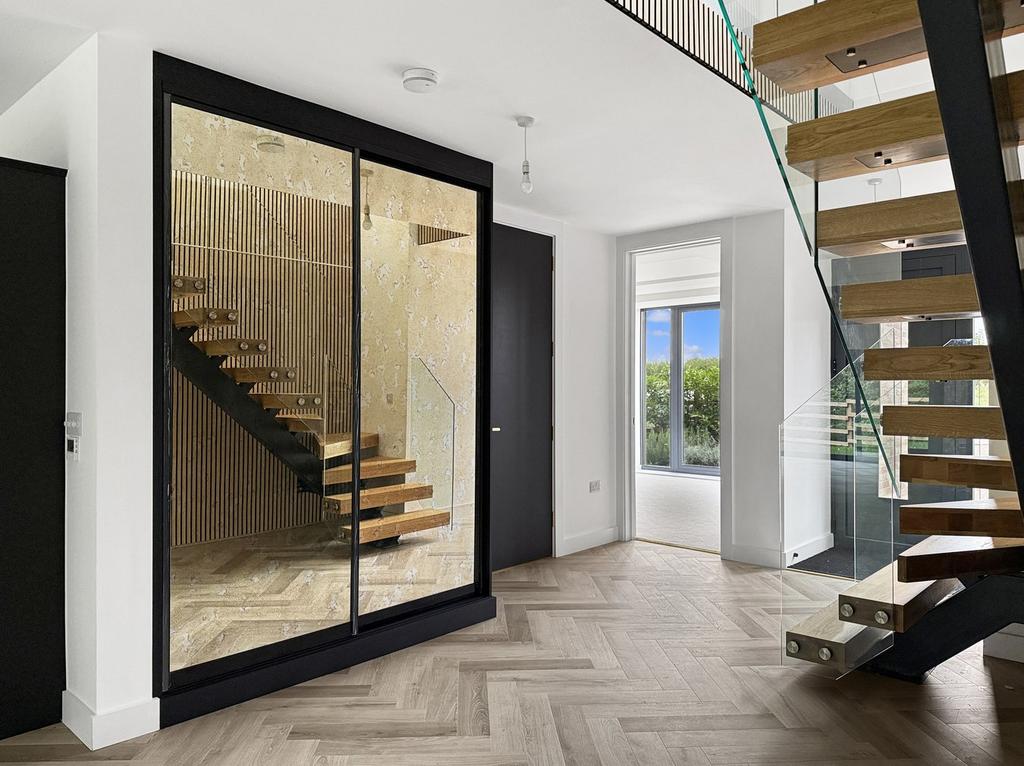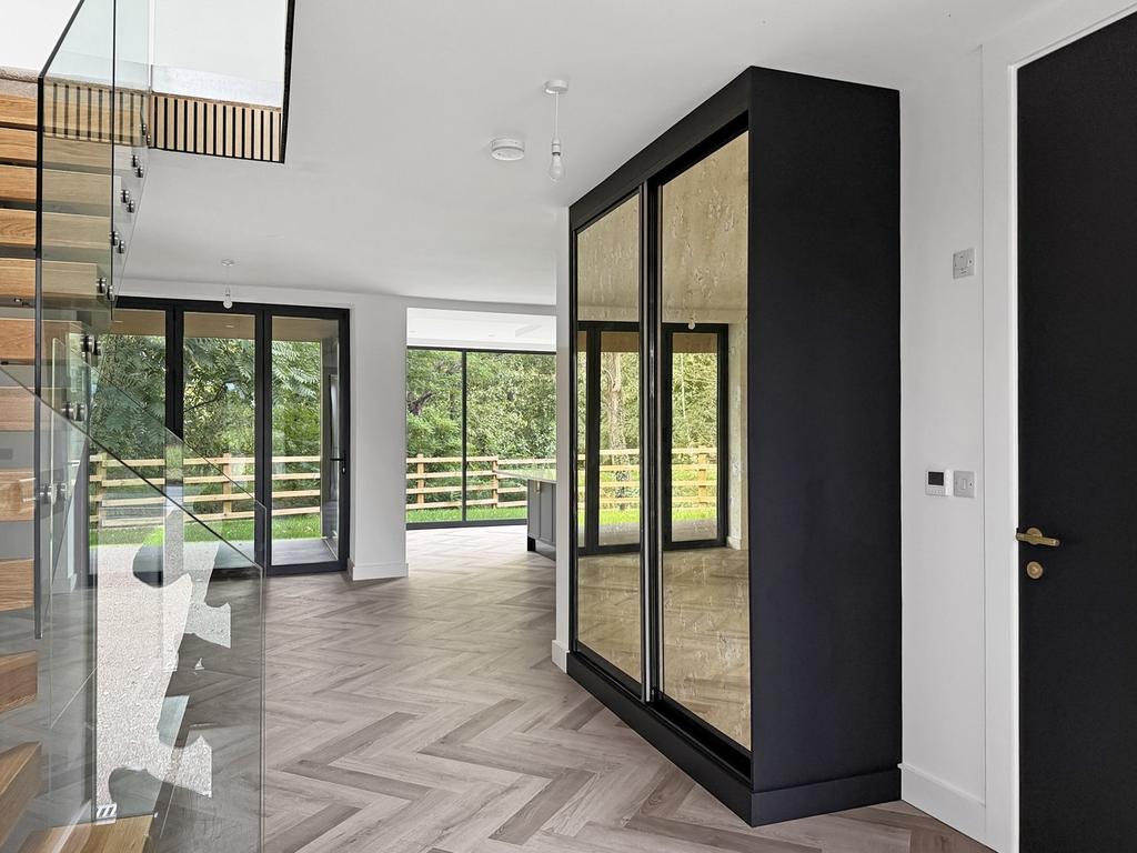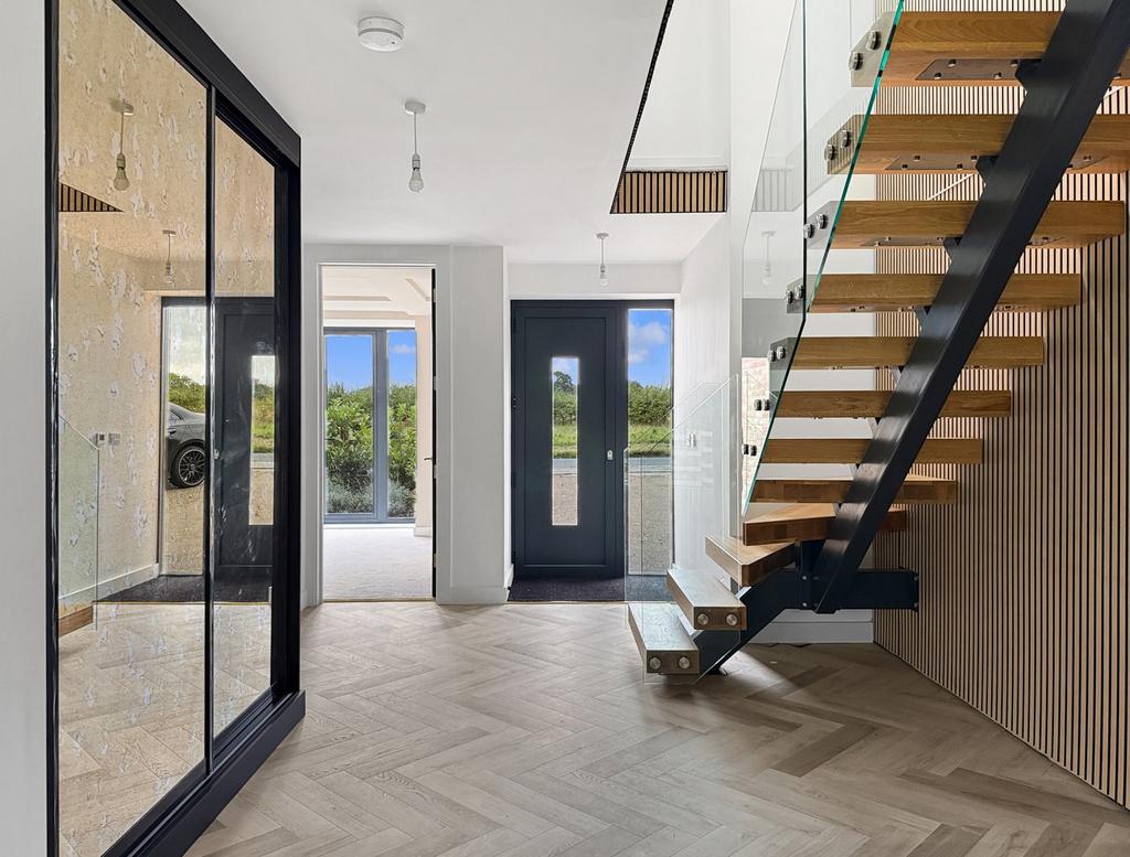 Upon entering Glass Gables, you are welcomed by an expansive reception hall, beautifully appointed with herringbone LVT flooring, a striking glass balustrade staircase, feature timber wall panelling, and underfloor zone-controlled heating that spans the entire ground floor. At the heart of the home lies an outstanding open-plan kitchen/dining/family room, measuring an impressive 37 feet. Designed to both entertain and inspire, the space boasts a timeless shaker-style kitchen with brass hardware, elegant stone work surfaces, a central island complete with inset induction hob, breakfast bar and ample storage. The room is further enhanced by floor-to-ceiling windows, LED spotlights, two sets of bi-folding doors, and additional oversized patio doors that seamlessly connect to a covered decking area—ideal for indoor-outdoor living.