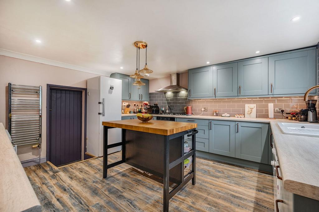 Base units with laminate worktop and stainless steel sink and drainer. uPVC double glazed window and door out to garden. Multi-fuel stove. Beamed ceiling. Slate floor.
