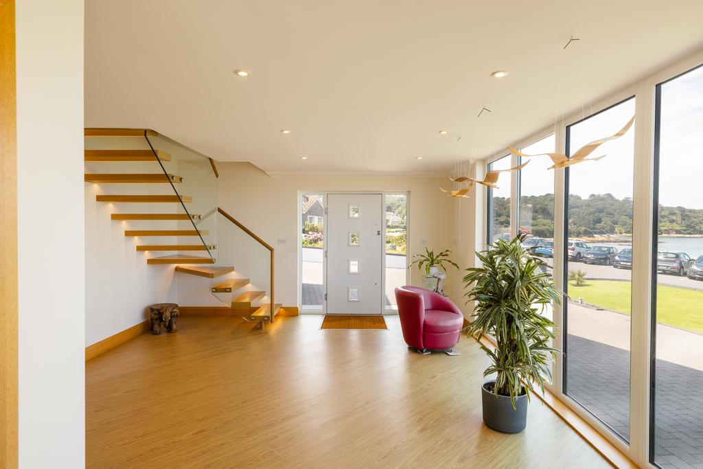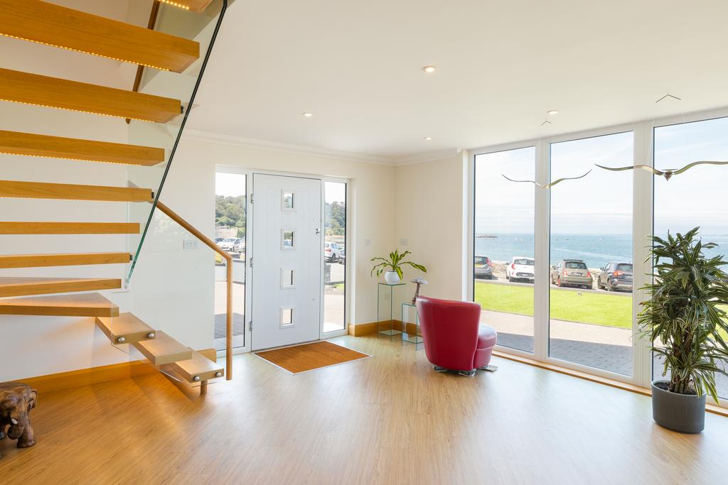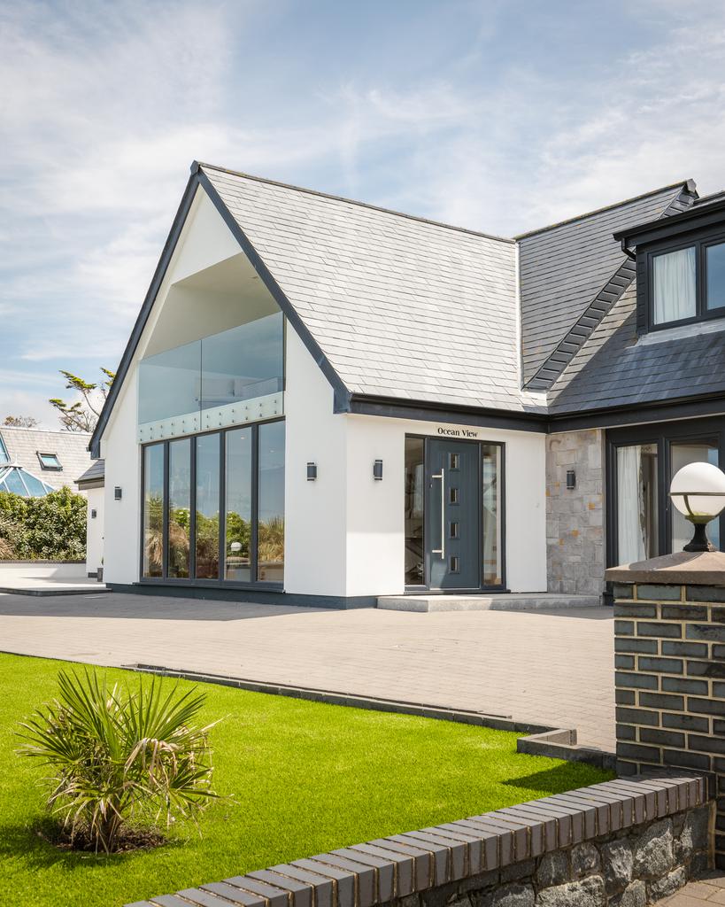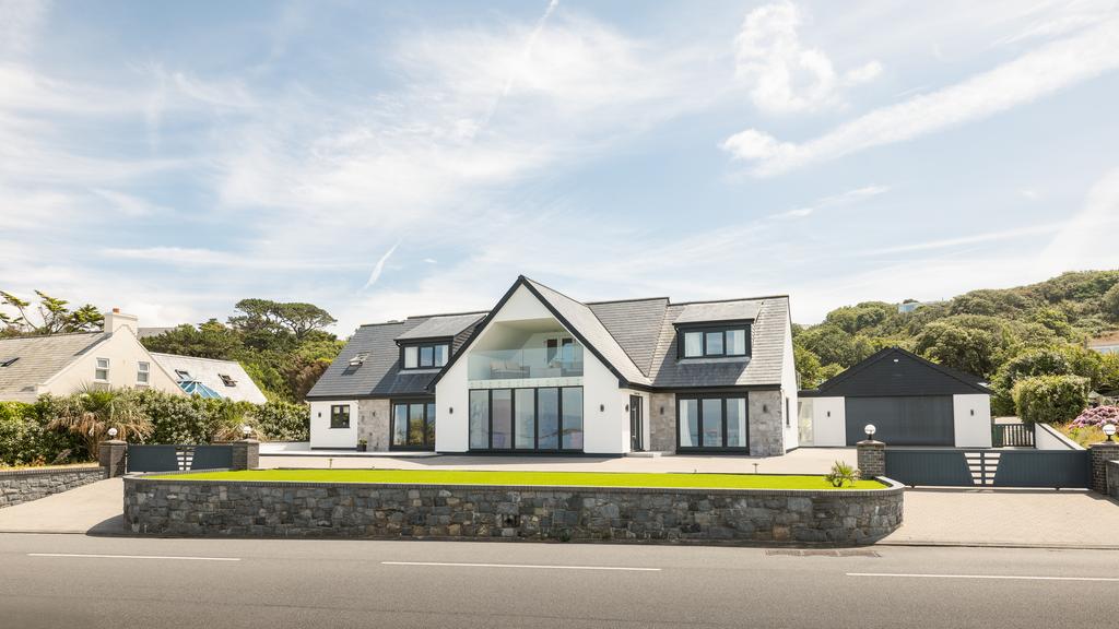 Stepping inside the property, the spacious entrance hall comprises a plant room, cloakroom, sitting room equipped with a built-in cinema projector and screen, bedroom four/study with en-suite, and a bright sunroom that invites natural light throughout the day. A superb open-plan kitchen/family room with multi-fuel burner and an adjacent dining room create a vibrant hub for a large family with access to the rear garden. Upstairs, there are three bedroom suites (one with balcony to the rear), each offering ample space and direct access to a further balcony where you can soak in the coastal panorama.