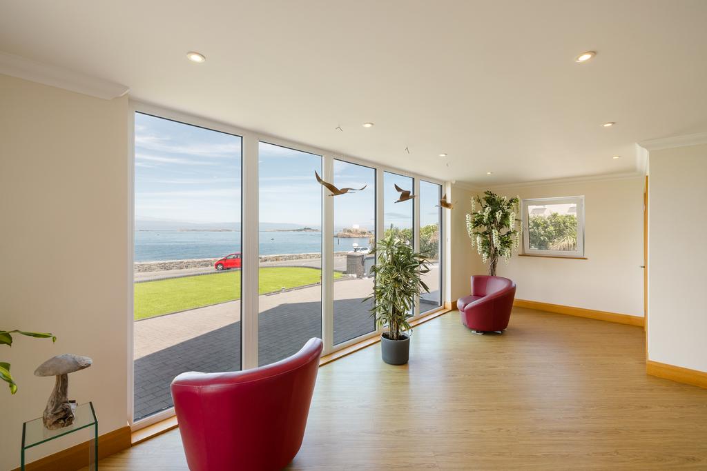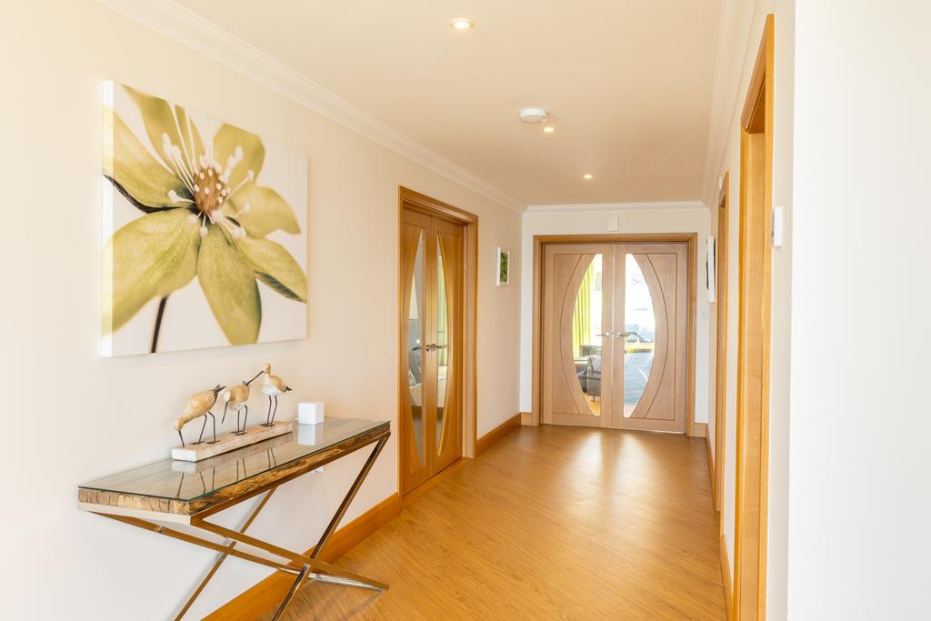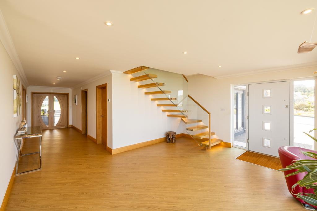 The property’s outdoor areas are equally impressive. A private, fully enclosed garden at the rear faces South, while the front of the home proudly presents sweeping sea views that captivate at every glance. Practicality is ensured with a double garage and generous parking facilities. There is also an indoor, heated swimming pool with hot tub and a dedicated changing and shower room.