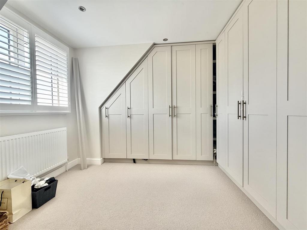 Bedroom Three - 3.39m x 2.75m (11'1" x 9'0") - Currently used a Dressing Room, double glazed windows to front to front, range of built-in wardrobes, radiator, carpet to floor and smooth ceiling with sunken spotlights.