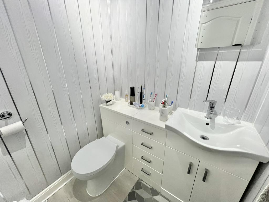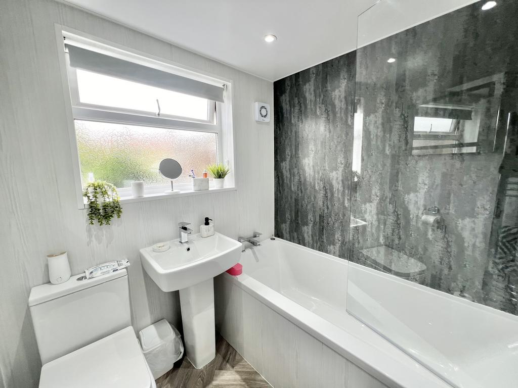 UPVC double glazed opaque window to the rear aspect, panelled bath with shower over, wash hand basin, low flush wc and wall mounted towel rail.
