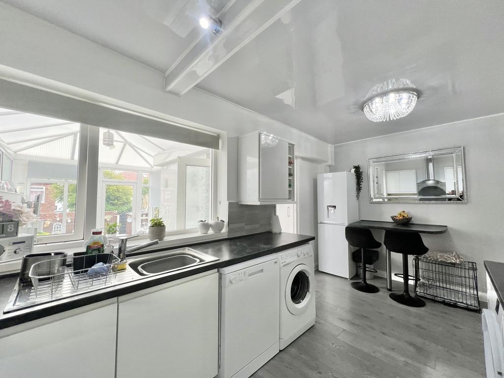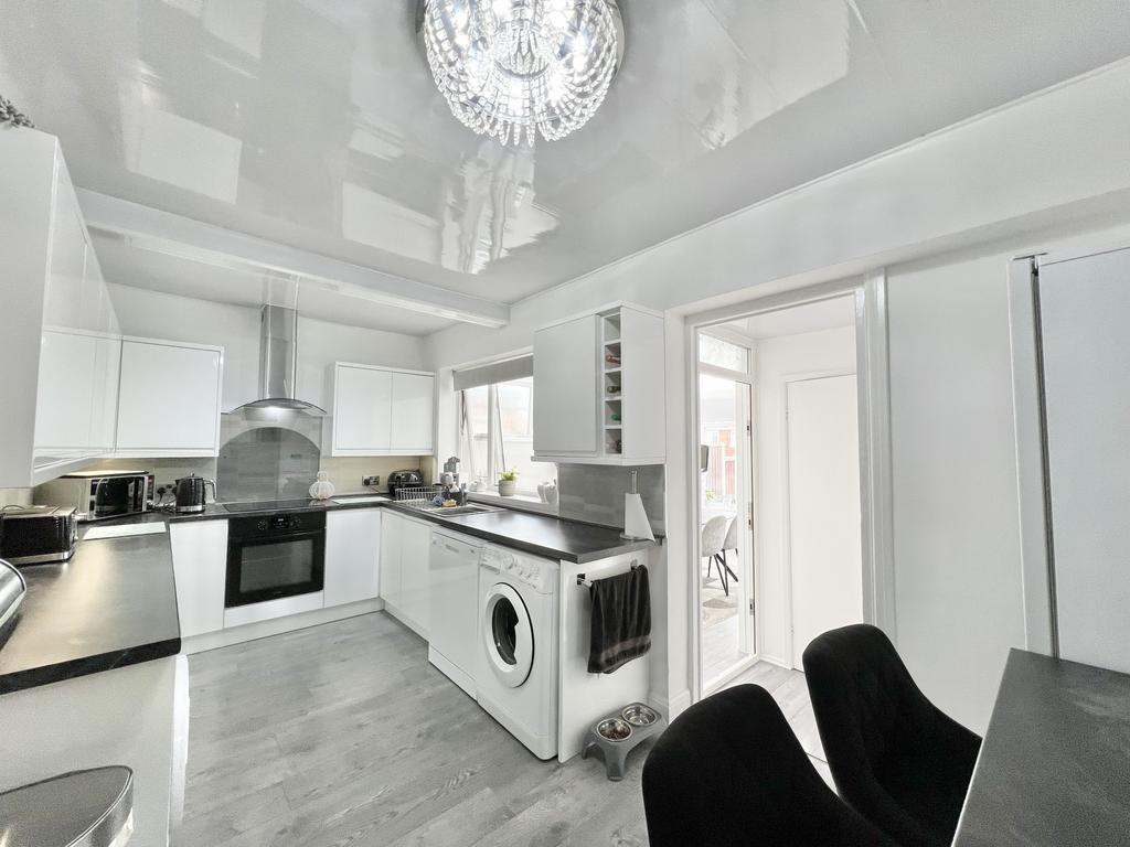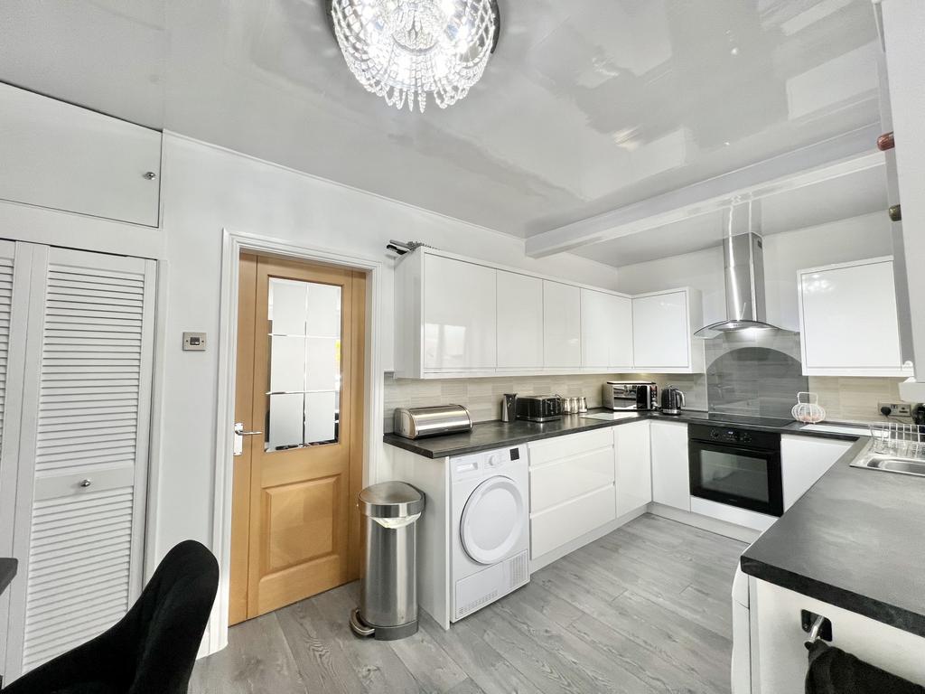 UPVC double glazed window to the rear aspect. Modern fitted kitchen with a range of wall and base units with complimentary work tops, integrated oven and induction hob with extractor fan over, sink and drainer with mixer tap, space for fridge freezer under stairs storage cupboard, plumbing for washing machine, dryer and dishwasher.