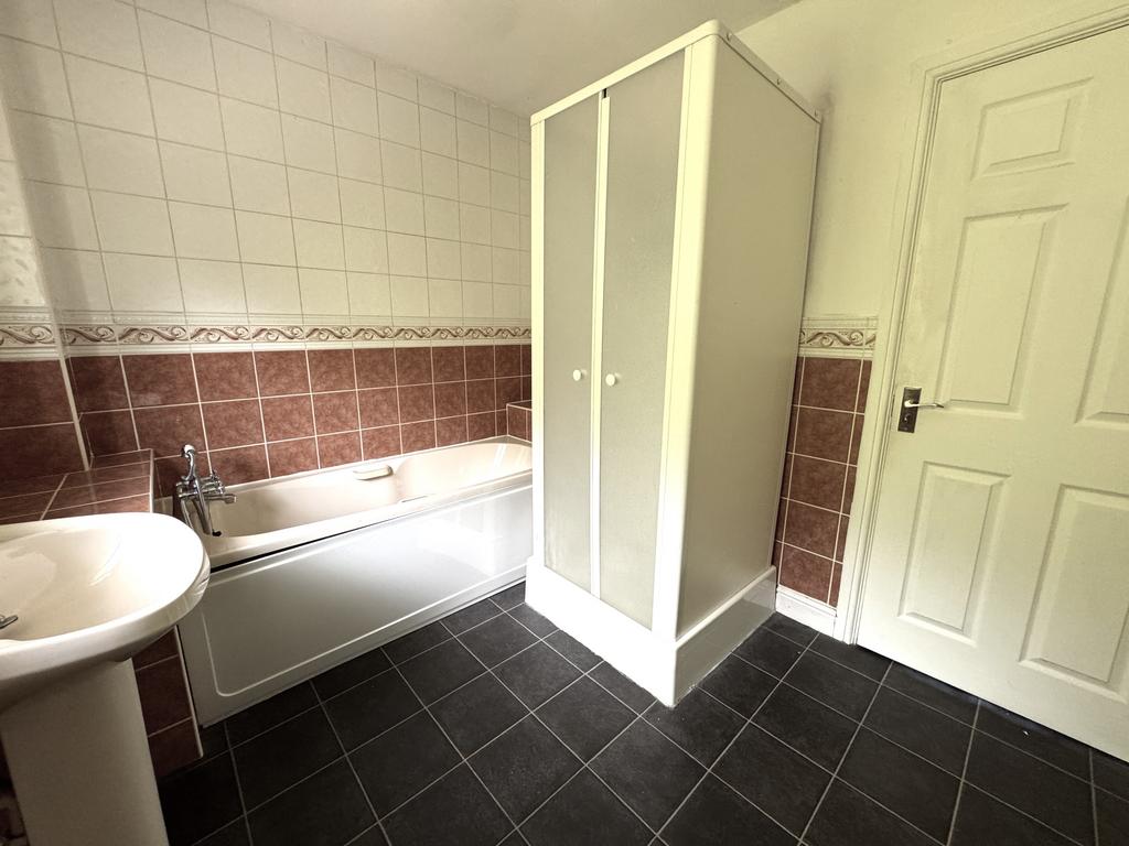 having low level wc, pedestal wash basin with chrome taps, bath with chrome hand held shower and mixer tap, separate walk-in shower cubicle with chrome thermostatic shower, extractor fan, shaver point, one central heating radiator and frosted Upvc double glazed window to rear elevation.