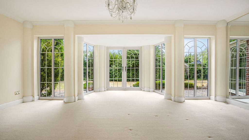 Lounge. Approached through double doors. Fireplace, mirrored wall, deep bay window with French door to the patio and floor level windows either side. Opening to: