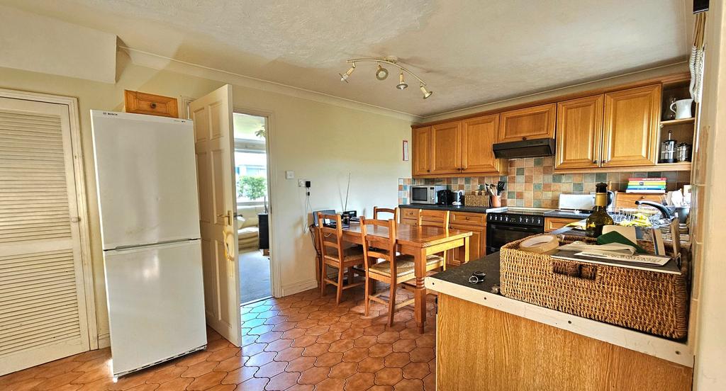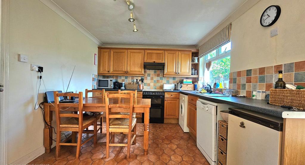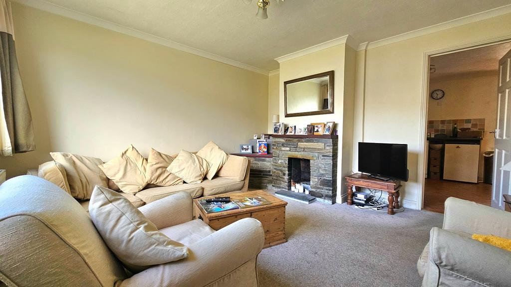Upon entering, you are welcomed by a bright hallway leading to a comfortable lounge featuring a feature stone fireplace and a large window overlooking the front garden. The spacious kitchen/diner spans the width of the rear of the property and is well-equipped with wooden cabinetry, space for appliances, access to the rear garden and downstairs w/c,